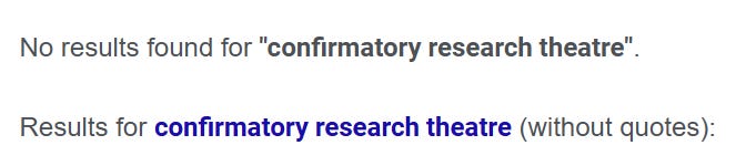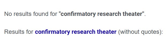 That phrase “confirmatory research theater” jumped off the screen at me. Did Claude. . . coin it? It seemed to have, given the “what might be called” construction, which in writerly contexts is usually a fancy way of saying “I just came up with this.” I googled the phrase and sure enough, it isn’t indexed anywhere with either the American (i.e., real) or British (i.e., fake) spelling: