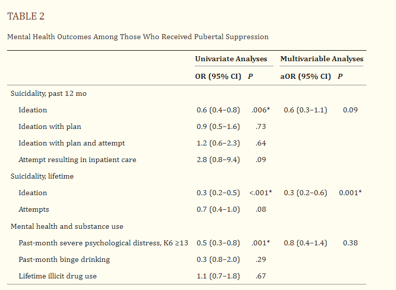 mental and social health — This links to one of Jack Turban and his team’s studies. It is, to phrase things bluntly, not serious research. It relies on a broken self-report data set known as the 2015 United States Transgender Survey that, among other problems, excludes detransitioners —click here and scroll down to “There are many reasons to be skeptical” if you are unfamiliar with why work based on the USTS often isn’t to be trusted. To interpret this data the way Scientific American is also neglects the possibility that poor mental health causes a lack of access to transition care rather than vice versa (because some clinicians and medical guidelines view solid mental health as a prerequisite to blockers or hormones). On top of that, the researchers found only one statistically significant correlation, out of three, in their most well-controlled model. By their own methodology and argument, in this model access to blockers had no statistically significant impact on past-month severe psychological distress or past-year suicidal ideation. Even in their simpler, so-called “univariate model” (meaning a model that does not control for other, potentially confounding variables), there was no correlation between access to blockers and more serious forms of recent suicidal ideation.