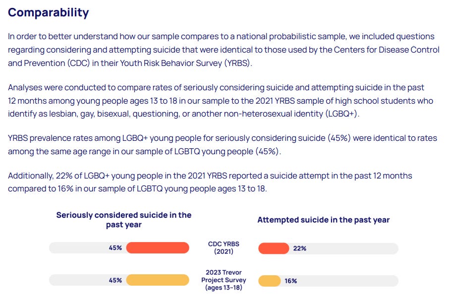 It’s true that the Trevor Project asked its respondents whether they had attempted or considered suicide in the past year, and that responses were alarmingly high. In its write-up of the survey, the organization touts that it got similar numbers as a more representative sample: the teen LGBT subset of respondents to the Centers for Disease Control and Prevention’s Youth Risk Behavior Survey (YRBS):