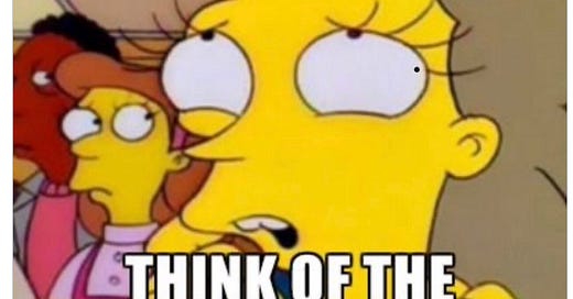 Questions? Comments? Insinuations? I’m at singalminded@gmail.com or on Twitter at @jessesingal. The lead image is a Simpsons meme Grace Lavery posted ridiculing those who are concerned about the long-term effects of puberty blockers. In the original version, Helen Lovejoy, a reverend’s wife known for her performative piousness and moral grandstanding, sobs “Won’t somebody please think of the children!” Lavery edited it so instead she is sobbing, “Won’t somebody please think of the bone density?”
