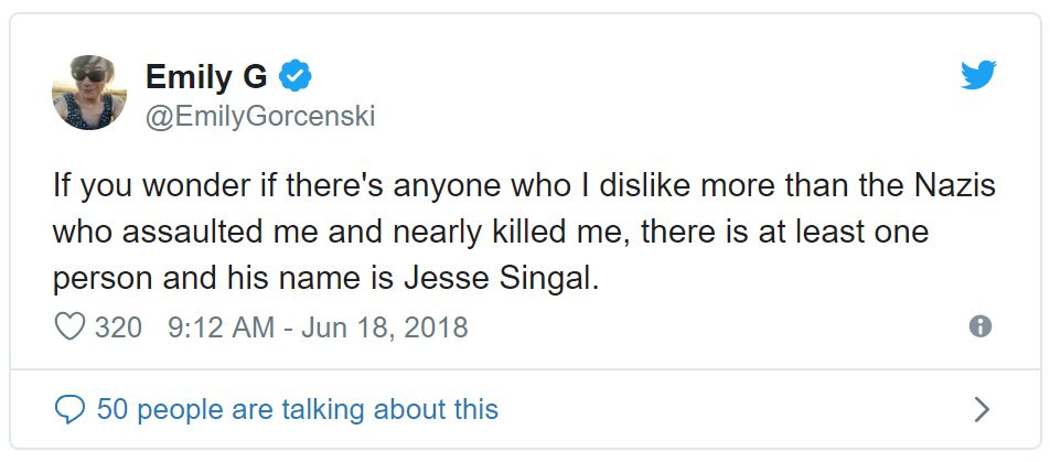 It’s probably a bad idea to respond to an article by someone who, after being literally, physically assaulted by a racist mob in Charlottesville, subsequently wrote that I’m the only person who she hates more than her attackers.