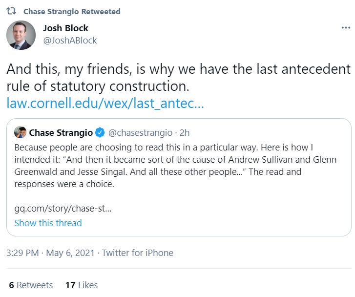 That was yesterday. Today, Strangio backtracked a bit, seeming to blame this both on an absent period but also on us rubes who “are choosing to read [the passage] in a particular way.” (The “particular way” in question being “the exact plain meaning of the text, as per basic linguistic conventions regarding the use of conjunctions,” I guess. God, we’re idiots!)