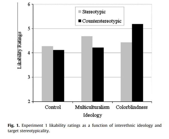 Here’s the abstract of the second study I want to discuss from the meta-analysis, “The effect of interethnic ideologies on the likability of stereotypic vs. counterstereotypic minority targets,” published in the Journal of Experimental Social Psychology in 2010: