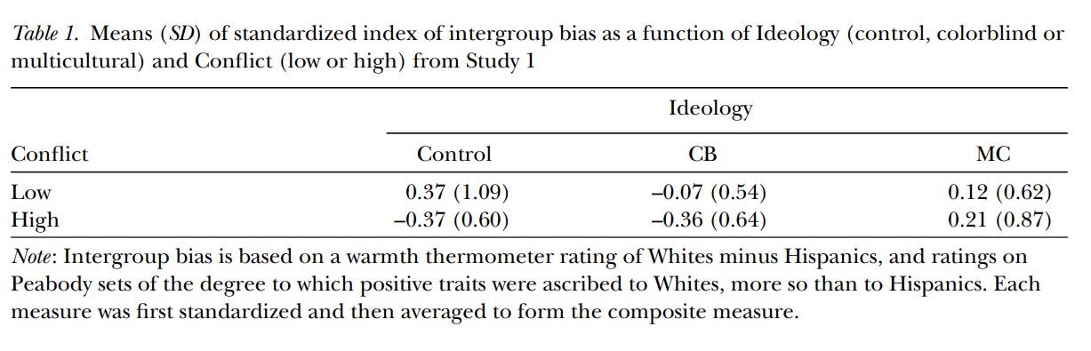 But you needn’t take my word for it — we can simply pull up the experimental studies in this area and evaluate them on their merits. To make my point, I’m just going to focus on three of them: two which were included in the meta-analysis, and one which Grant presented to me as solid, generalizable evidence for the potential shortcomings of colorblind approaches to fighting racism. To be clear, I have not read each and every one of the experimental papers included in the meta-analysis. But I can just about assure you that if you take on that task in the search for carefully constructed and high-quality studies employing anti-QRP measures that offer strong or even moderate evidence on these questions, you will come up empty, or nearly empty. This is not quality research.