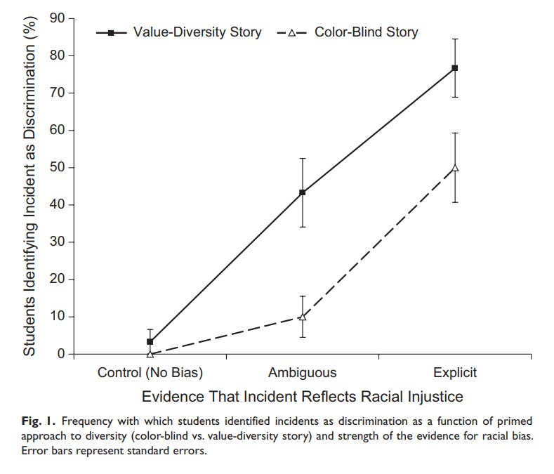 The real task went as follows: a “second experimenter, blind to experimental condition, read aloud three scenarios depicting inequitable behavior alleged to have occurred at nearby schools.” The idea was to see how the students, primed with different understandings of diversity, would respond to one of three vignettes to which they were randomly assigned.