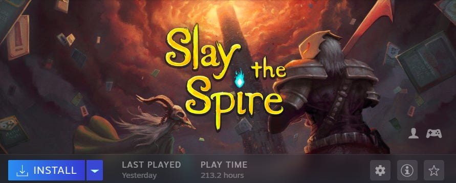 -On a slightly pathetic note, I really liked Slay the Spire, a video game I reinstalled the other night, immediately lost two hours to, and then promptly re-uninstalled. I’ve been through this cycle a few times now because it is one of the most devilishly addictive games I have ever played, as you can see from this page on Steam, a platform that lets you purchase and download games, informing me I’ve dumped more than 200 hours into it — that is, enough time to, say, become reasonably competent at beginner-level French (typing that made me wince).