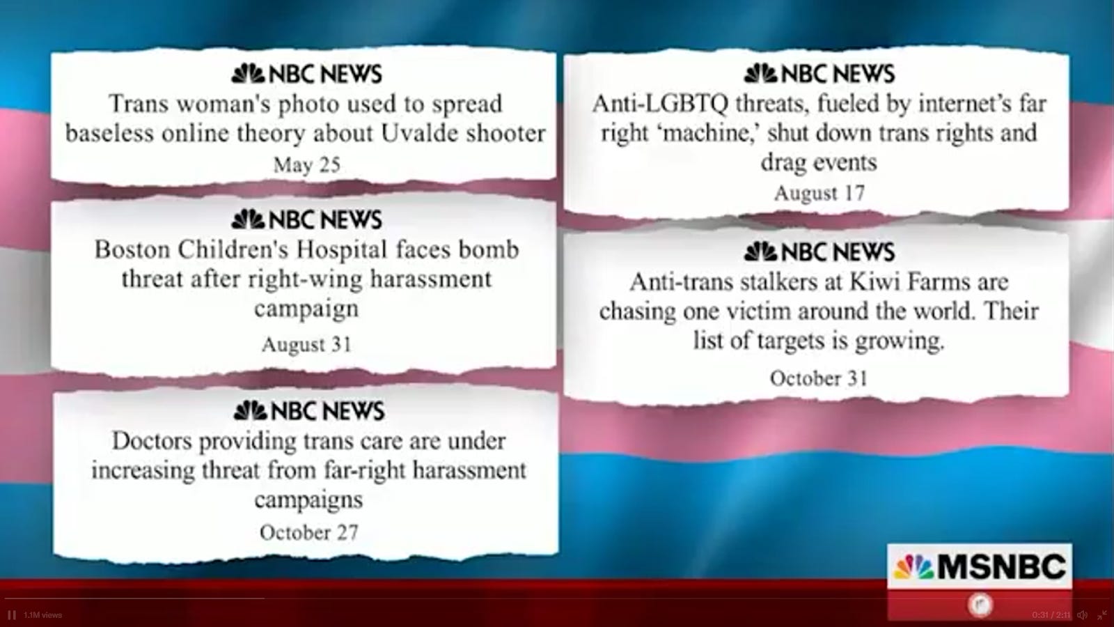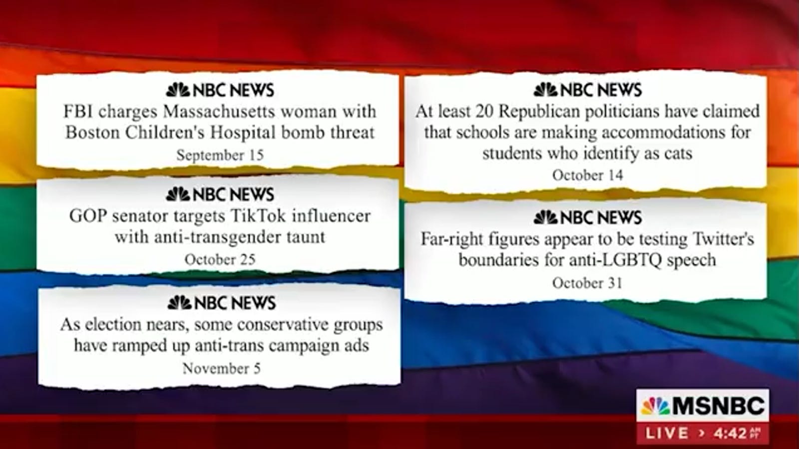 Collins starts by asking, “Am I doing something wrong here?” Then he runs down his and his colleagues’ tireless coverage of anti-LGBT rhetoric on the right, reading a bunch of headlines that are splashed on-screen: