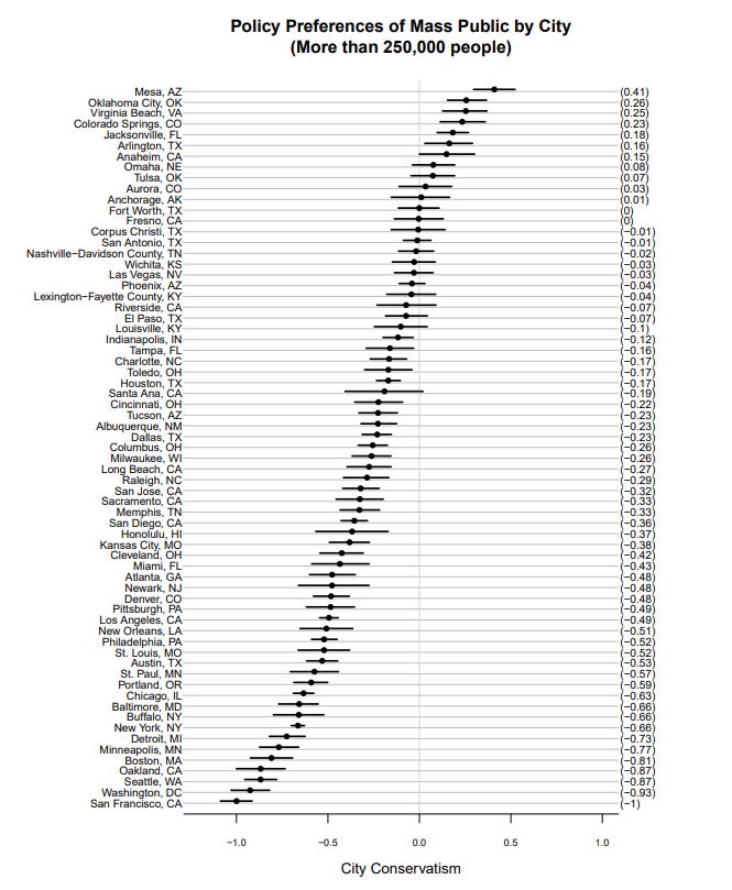 It’s a side note, but I randomly found this study — I haven’t checked the methodology — ranking how liberal or conservative major cities are. Colorado Springs is fourth most conservative, by this measure, but check out that skew, which shows that liberal cities are far more liberal than conservative cities are conservative: