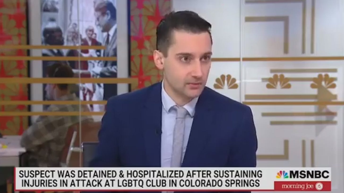 On Tuesday’s Morning Joe, Ben Collins, who “covers disinformation, extremism and the internet for NBC News,” gave what I found to be a very strange soliloquy about Club Q, an LGBT nightclub in Colorado Springs where five people were killed and about 18 injured by a man named Anderson Lee Aldrich on Saturday night.