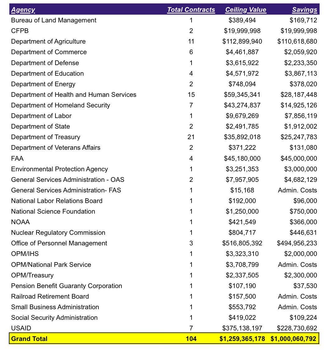 Through 1/29/2025, 85 DEIA related contracts totaling ~$1B have been terminated within the Dept. of Ed, GSA, OPM, EPA, DoL, Treasury, DoD, USDA, Commerce, DHS, VA, HHS, State, NSF, NRC, NLRB, PBGC, USAID, RRB, SSA, SBA, BLM, CFPB, NPS, and NOAA.