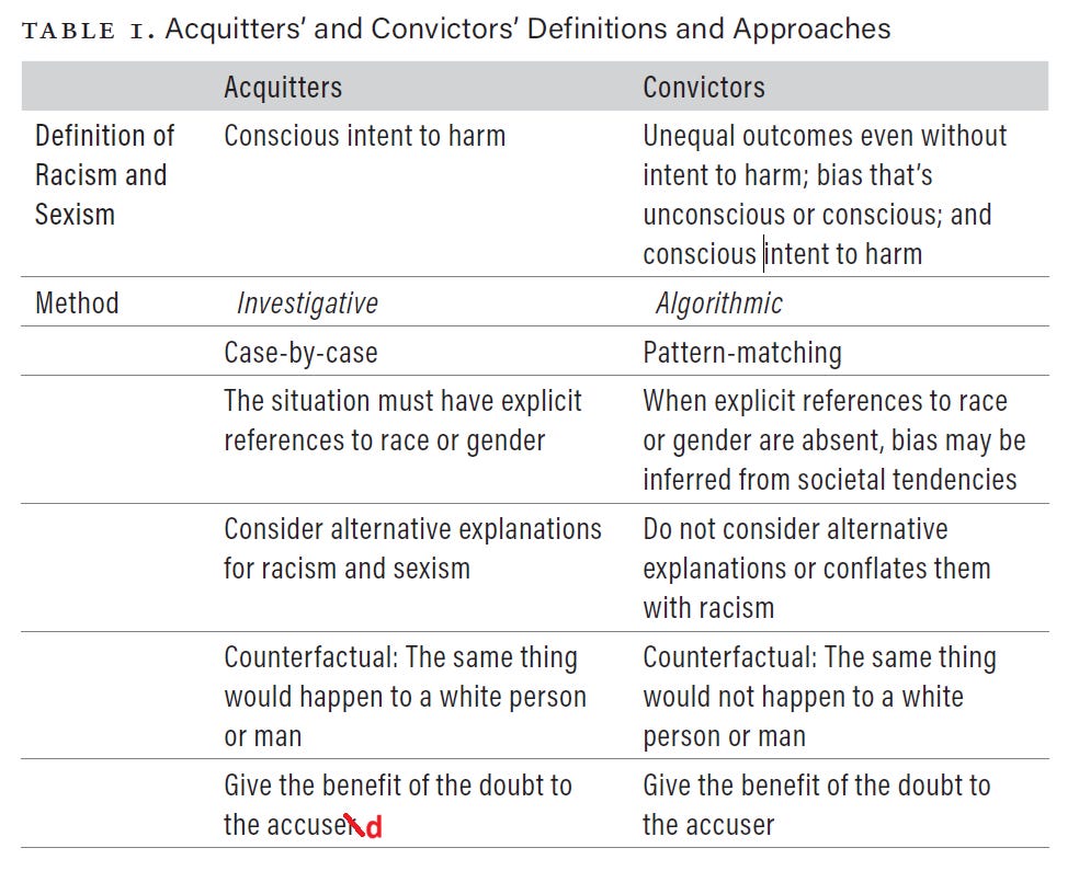 Yes, I agree that motivated groups do that. I don’t think they realize they’re doing it, but the motivated convictors say almost everything that we ask about is racist and sexist, and the motivated acquitters say almost everything we ask about is not racist or sexist, [and] each comes up with these logics that allow them to say that that’s true all the time. So, for the motivated convictors, you know, we’ll ask them, “Have you ever seen this particular form of racism?” And they’ll say, “Well, no, but I must have. . . [and] my own evidence from my own life is unimportant. We know that racism is everywhere in America, so therefore I must have seen it.” Whereas the motivated acquitters are on the opposite side. In any accusation of racism or sexism, they think that the person who made the accusation is up to no good. They are out to make money; they’re out to make a name for themselves; they’re trying to divide the American people; and so, why should we take that accusation seriously? It’s coming from a source who has bad motives. So, they dismiss other people’s accusations out of hand.