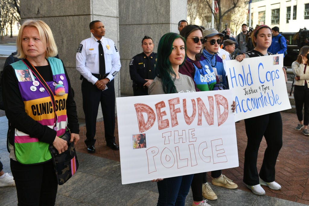 Image: CHARLOTTE, USA - JANUARY 28: People gather to protest against the police violence following the killing of Tyree Nichols on in Memphis on January 28, 2023 in Charlotte NC, United States. The US city of Memphis released January 27, 2023 graphic video footage depicting the fatal police assault of a 29-year-old Tyre Nichols, as cities nationwide braced for a night of protests against police brutality. Five Memphis officers were charged with second-degree murder in the beating of Tyre Nichols, who died in hospital on January 10 three days after being stopped on suspicion of reckless driving. (Photo by Peter Zay/Anadolu Agency via Getty Images)