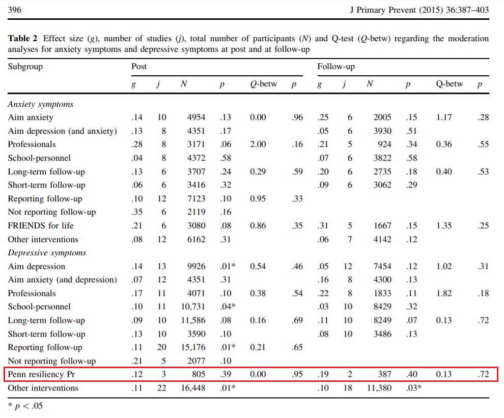 Meta-analysis (2), meanwhile, looked at just three PRP programs out of a total of 30 programs evaluated. Seligman argues that “At follow-up, which ranged from three to 48 months, effects were significantly larger than zero regarding depressive (but not anxiety) symptoms.” This isn’t true for the PRP programs — Table 2 shows no statistically significant effects on depression symptoms at post-intervention or follow-up.
