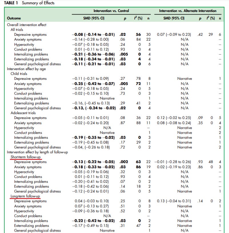 Similarly, a 2015 (2) meta-analysis in The Journal of Primary Prevention examined 30 peer-reviewed, randomized or cluster-randomized trials of universal interventions for anxiety and depressive symptoms in school-age children. There were small but significant effects regarding anxiety and depressive symptoms as measured at immediate posttest. At follow-up, which ranged from three to 48 months, effects were significantly larger than zero regarding depressive (but not anxiety) symptoms.