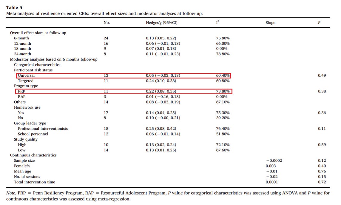 But let’s look at the meta-analyses themselves. Table 5 of meta-analysis (1) reveals that of the included studies, 11 were of PRP and presented longer-term (rather than just immediate post-intervention) data. The average effect size was a Hedge’s g of .22. This is considered small. Not ‘nothing’ or “non-existent,” but small. One problem is that there is also significant heterogeneity (I² of 73.80%, for the nerds), and if you go back to Table 2 to get more information about the studies, you’ll see that several of the PRP studies with the more impressive effect sizes at followup on the list, like Cardemil et al, 2002 (0.78), Wijnhoven et al, 2015 (0.36), and Yu and Seligman, 2002 (0.45) were conducted on targeted, not universal populations. This is a crucial distinction, because the entire premise of CSF is that it can be given to everyone. It’s reasonable to expect that you might get larger effect sizes with targeted programs because of regression to the mean and other fairly predictable statistical effects, but the point is even 0.22 — already ‘small’ — might be an overestimate of PRP’s true effect size in universal contexts. Sure enough, the Hedge’s g of all universal studies in the meta-analysis (including both PRP and others) at followup was just 0.05, veering toward ‘tiny.’ All of which suggests that even the ‘small’ effect observed here might be overstating the evidentiary base for PRP in CSF-style universal settings, though to know for sure we’d have to average the effects of all the universal PRP interventions evaluated in this study, which I’m not going to do at the moment because we are already so deep in the weeds we cannot tell if it is day or night.