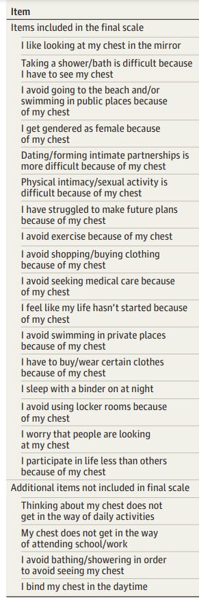 Another thing you might notice is that many of these items could be endorsed by a cisgender adolescent female getting used to having breasts for the first time, which can surely be an uncomfortable and sometimes even traumatizing experience. This is concerning given the potential issues with differential diagnosis here. Would this scale be able to differentiate a kid high in anxiety, depression, or other mental health symptoms who is (understandably) freaking out about growing breasts from a kid who has the sort of deep-rooted, specific gender dysphoria supposedly ameliorated by youth gender medicine? There’s no way to know because it doesn’t appear anyone has asked.