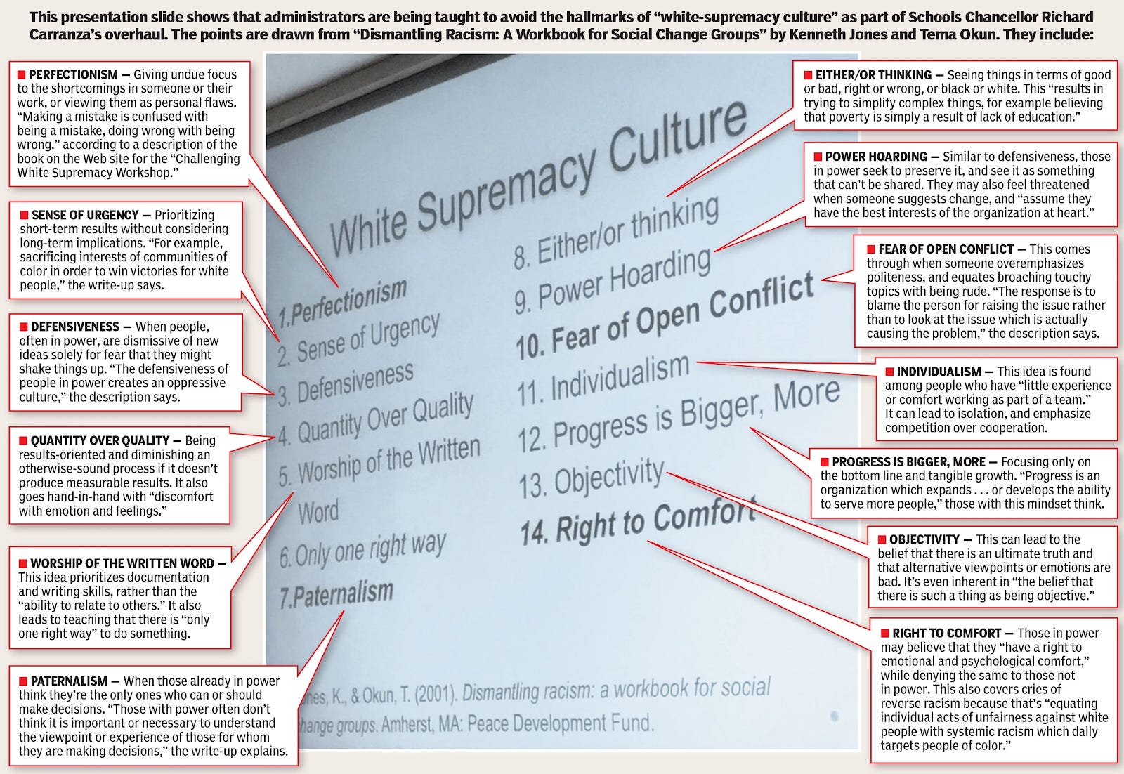 The story includes the above image — full size here — which connects the 14 “White Supremacy Culture” characteristics being taught to administrators with excerpts from a description of the source material, Dismantling Racism: A Resource Book for Social Change Groups. According to the Post’s reporting, “an insider said [the above slide] was part of mandatory training sponsored and funded by the department’s Office of Equity and Access and recently administered to principals, central office supervisors and superintendent teams.”