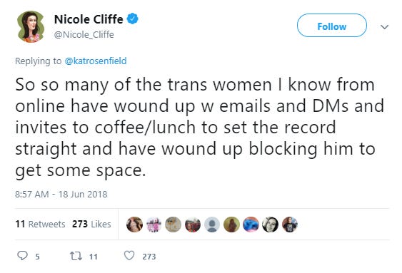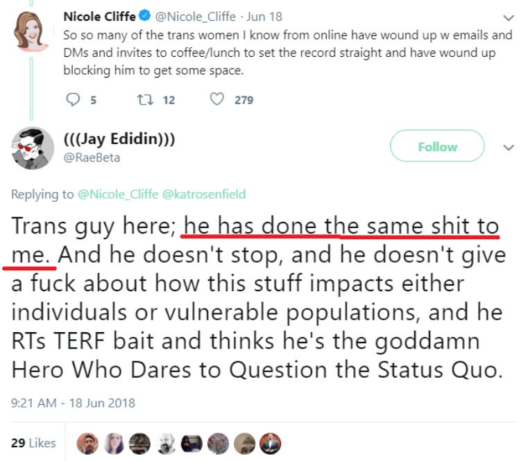 Again, I can draw upon my own experiences being targeted by her. As soon as Cliffe tweeted what she tweeted about me, people popped into her replies to up the ante and spread new and better and more specific lies. For example, Jay Edidin, a highly regarded trans journalist, quickly identified himself as one of the ‘victims’ of my egregious behavior: