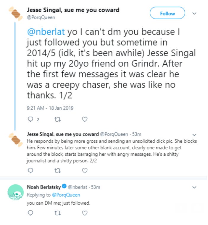 Another, more recent one is an account named @PorqQueen. It changed its display name to “Jesse Singal, sue me you coward” and approached Noah Berlatsky, a liberal writer who is not a fan of mine, with a spectacular story about how I had sent a dick pic (something I’ve never done to a girlfriend, or to anyone else in my life, let alone a stranger) on Grindr (a site I’ve never used, which I say with no judgement since a friend of mine met his husband there):