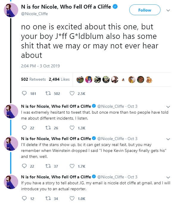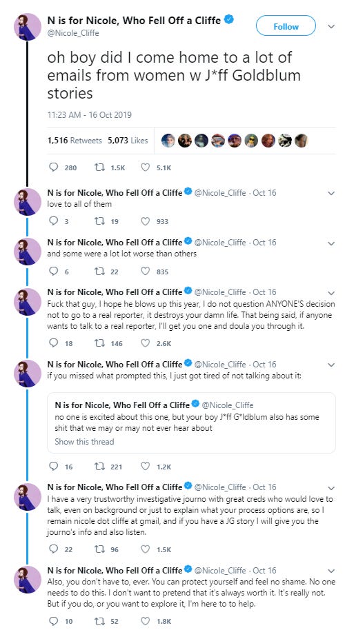 So in this post I want to briefly explain the background of all that, tie it into the Goldblum thing, and argue that Cliffe just shouldn’t be trusted in these cases where she purports to be sitting on inside information about some guy’s sleazy behavior. As I’ll explain, that doesn’t mean she should take no action in these cases or that whisper networks aren’t sometimes very important; there are easy, obvious alternatives Cliffe can pursue. But in addition to the obvious moral problems with what she is doing, by publicly waving around half-formed allegations in this manner, Cliffe is likely making the journalistic task of actually getting to the bottom of the Goldblum situation more difficult than it would have been otherwise.
