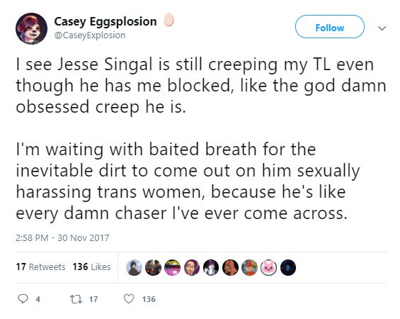 It’s always the same general storyline: me aggressively, intrusively communicating with people online, asking personal stuff or just leading with the dick pic. There are never any screenshots and never, or rarely, named victims (with an exception I’ll get to shortly). Over and over and over and over. How many more examples of this am I unaware of because they didn’t happen on openly visible parts of the internet? What are people saying in private chat rooms and group DMs? The whole point of this campaign is to freak me out, to get me to ruminate on questions like this, and to eventually cause me to determine that it just isn’t worth it to write about gender dysphoria anymore, because the consequences of continuing to do so are so potentially severe.