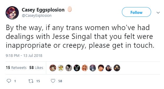 While I have some suspicions, I don’t really know, with any certainty, who is behind most of the accounts who have participated in this whisper campaign, how many people are spreading these rumors, and what the overall breakdown is between the people who initially fabricate and seed these stories and those who spread stuff they “heard online” second- or third- or nth-hand from the original liars. But whoever is behind this, I have to admit, has been quite successful. The Jesse-Singal-As-Online-Sex-Pest meme completely broke out beyond small weirdo accounts.