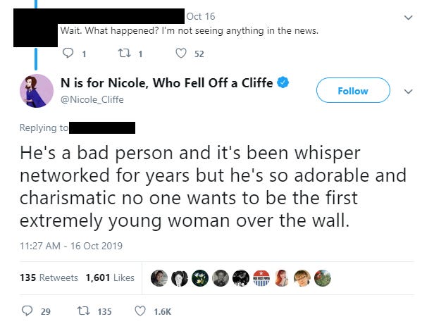 Along the way, whenever I have debated whether and how to respond to all this (and people who follow me on Twitter know that I do mention it from time to time), I could at least rest assured that most of the people spreading this garbage 1) didn’t have large platforms; and 2) might not be taken seriously by the average internet denizen. Until Cliffe arrived on the scene. When she used her sizable megaphone to blast these rumors out to the world, it was horrible. Genuinely. I would not wish that experience on anyone. She is, again, extremely influential in my industry, and the first tweet alone racked up four-digit retweets, meaning that at least tens of thousands of people saw it. Knowing — or feeling like — everyone in your industry is talking about you in that manner, whispering about what an evil and creepy and exploitative person you are, is just an awful sensation, like you can’t breathe. I still can’t believe she did that, and I’m still frankly furious about it. Cliffe is not a moral or a trustworthy person.