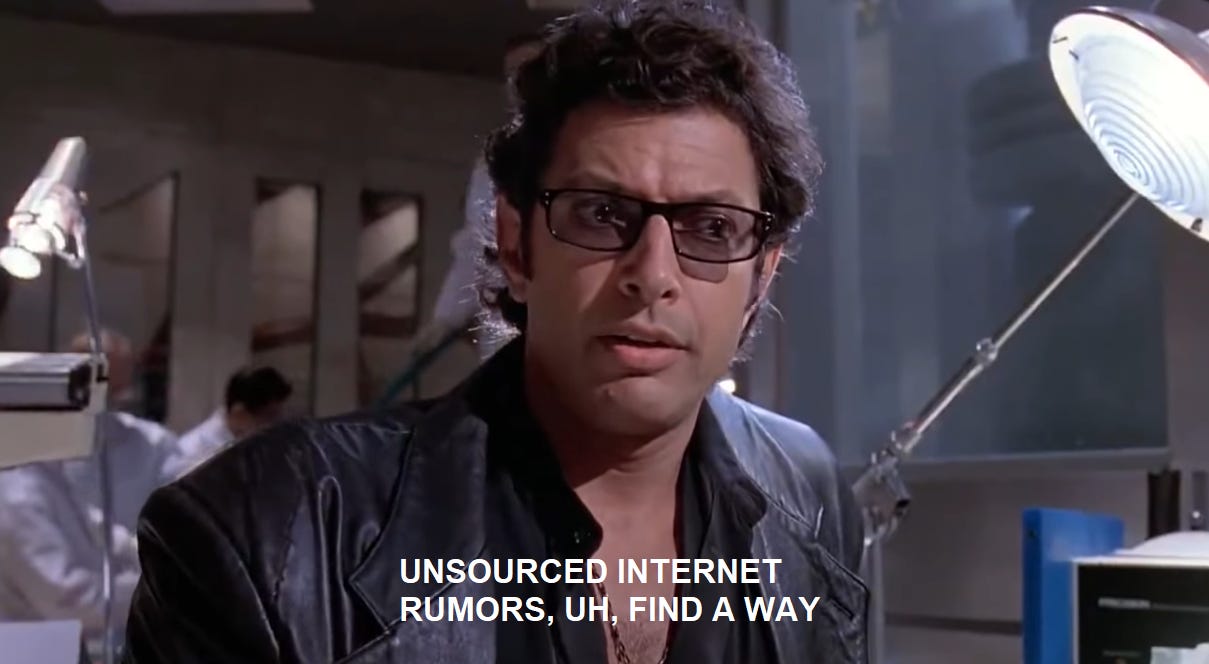 It doesn’t matter that no one knows exactly what he’s been accused of, what the quality of the evidence is, what sort of stories supposedly flooded Cliffe’s inbox, or any of that: This is now a True Thing among the sorts of (rather misguided) people who look to Nicole Cliffe for moral guidance. One of the tweets responding to Cliffe’s claim laments, “well... there goes that.” Some people have enjoyed Goldblum’s work for years or decades, only to have decided on the basis of a handful of morally charged, vague tweets from an unreliable narrator that he’s terrible now. That is how quickly online rumor campaigns can spread and have their desired impact.