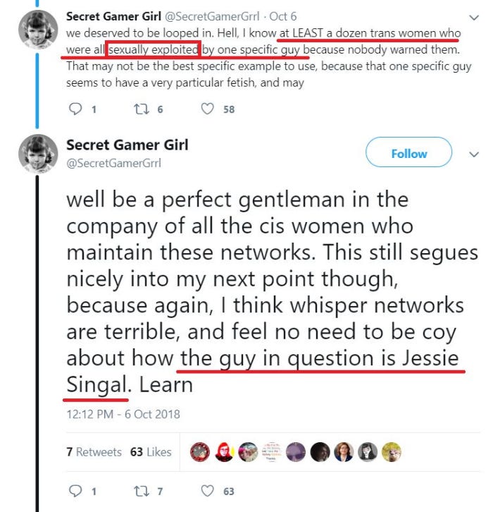 First, it was somewhat larger but still pseudonymous accounts, mostly in social-justice spaces, that started spreading these rumors — sometimes with what appears to be a bit of further embellishment. “Secret Gamer Girl,” with 6,000+ followers, is one example: