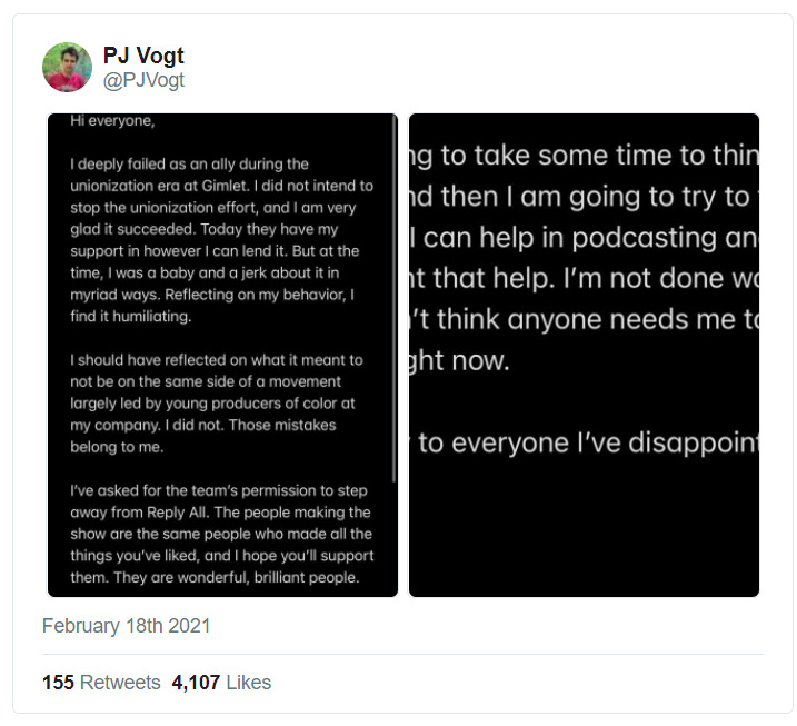 Another reported article on the controversy, published in the New York Times, further contextualizes Vogt’s and Pinnamaneni’s initial opposition to the unionization drive. For one thing, the unionization effort was initially hidden from their team due to their proximity to management, meaning they had a solid reason to distrust the efforts (even if the organizers, for their own parts, may have had good reasons to take this approach). The internal conversation surrounding unionization had also become toxic: The Times reports that “there was fear that expressing uncertainty would bring with it a label of being anti-diversity, said one former employee who was not on the ‘Reply All’ staff and did vote to unionize. ‘There was a lot of good faith skepticism,’ that person said.” I wonder why people thought simply expressing skepticism about the union could lead to reputational damage…