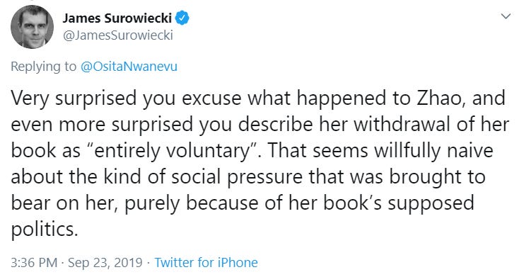 There’s a lot to be annoyed by in Nwanevu’s piece, but, in an egocentric way, this sentence sits near the top of my list: “Zhao’s Blood Heir—the novel that inspired Soave’s allusion to book burnings, the novel Singal suggested would never be released thanks to a controversy that “derailed” Zhao’s career—will be out in November.” For one thing, ‘derailed’ appears in the headline of my piece, not the piece itself — and certainly seemed appropriate at the time, in the wake of the unpublication of a much-celebrated debut!