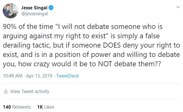 Singal and others who are critical of the social justice left—a group that ranges across the ideological spectrum and includes Bari Weiss, Ben Shapiro, Daphne Merkin, and Katie Roiphe—accuse the left of being footstampingly insistent on their views, to the detriment of healthy debate. In fact, it is the “debate me, coward” crowd that has made it impossible to have arguments in good faith, because they demand, unwittingly or not, to set the terms.