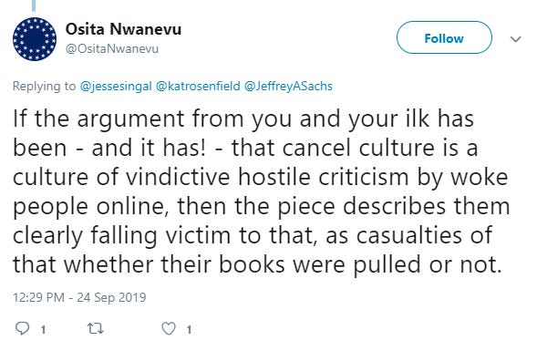 I’ll repeat myself: This is a fundamentally bankrupt way of doing journalism and criticism, and it should be treated as such. It’s also a wasted opportunity. Nwanevu and Livingstone are intelligent, passionate professional writers at one of the top publications in the country. Surely if they engaged with these issues more seriously, they could advance the conversation in useful ways. For instance, it can’t be that Nwanevu is unaware of the incidents I highlighted further up. So I’ll repeat: What does he think of them? It could, for example, be that he thinks Breitbart was within its rights to shine a brutal spotlight on Monica Foy for making a joke about a dead cop, and that that’s just the world we live in now — sometimes you make a bad Twitter-joke and a bunch of people drive you from your home with rape and murder threats, and there’s nothing to really be done about it. But without hearing Nwanevu’s thoughts on the sorts of incidents that motivate thoughtful critics of “cancel culture” like Jon Ronson to write about this subject, there’s no way to know if this is his view.