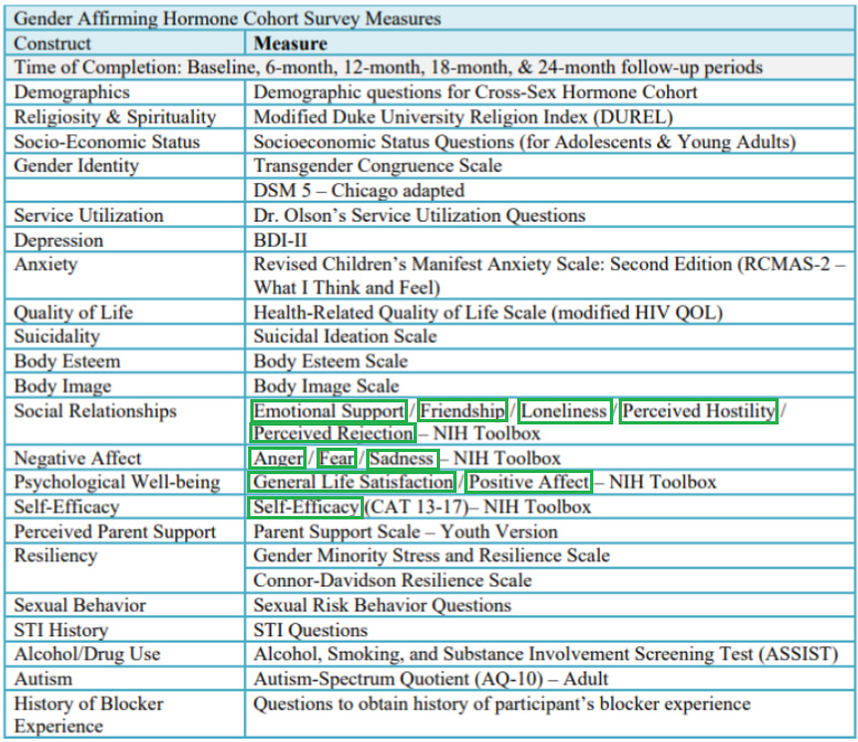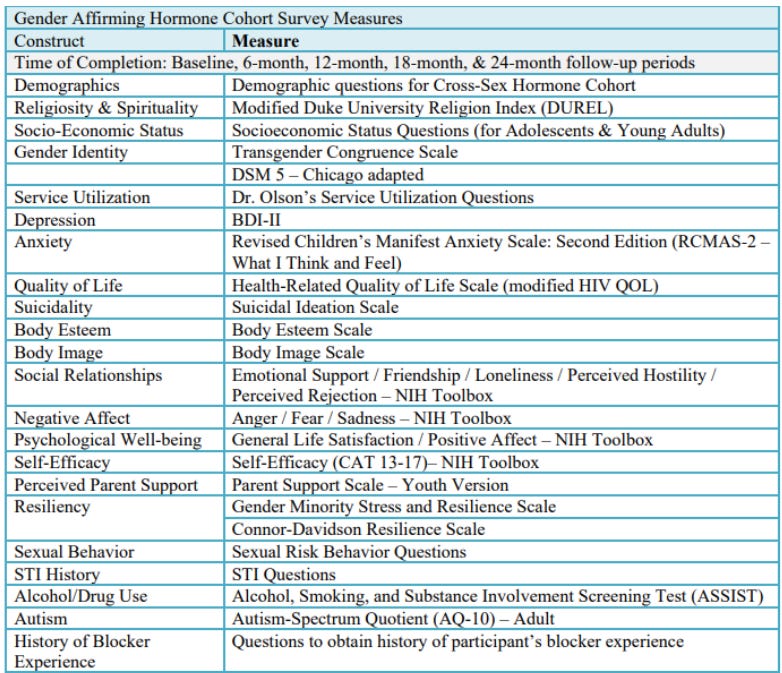 In Appendix II of the protocol document the researchers include a helpful chart of the instruments they plan on using to track these and other variables. It’s a bit out of date, though, as it still uses “cross-sex hormones” rather than “gender-affirming hormones” and includes a couple of variables that the researchers subsequently dropped. A more up-to-date version is downloadable here, and here’s the part of it listing all the variables for which data was collected at every six-month wave of the research effort (that’s the data the researchers would be most likely to report on in a big study):