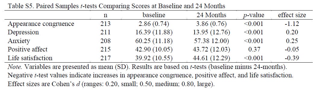 I guess someone could say “That’s not fair — they did at least publish those Appearance Congruence subscale results.” But that isn’t a validated measure of gender dysphoria, a phenomenon that goes well beyond discomfort with one’s appearance.
