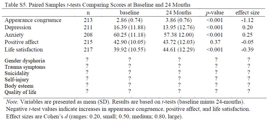 In fact, most of these variables aren’t mentioned at all in the NEJM paper or its supplementary appendix. “Gender dysphoria” comes up early, because how could it not in a paper about, well, gender dysphoria, but there’s no mention at all of any gender dysphoria scale (this is the one missing variable they have a partial but non-exculpatory explanation for, which I’ll get to). Neither the phrase “quality of life” nor any mention of the Health-Related Quality of Life Scale appear in the paper. The authors do report on the number of completed suicides and instances of suicidal ideation in the sample (more on that in Part 2), but there’s zero mention of the suicidality scale — the one they reported on in the baseline characteristics paper — that would allow them to statistically analyze the sample’s level of suicidality over time the way they analyze other variables’ longitudinal trajectories. (They definitely have data on body esteem and suicidality, at least, because they report the baseline numbers for these variables in a 2021 paper.)