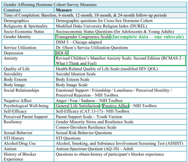 But if the Transgender Congruence Scale and the Gender Minority Stress and Resilience Scale are, in fact, “likely the best existing measures” to evaluate gender dysphoria, why are they both missing from the NEJM article, other than that one TCS subscale? And according to the protocol, the kids in this cohort were also asked about their DSM-5 gender dysphoria symptoms until a separate 2021 Letter of Amendment halted that question. But that data, too, is absent from the NEJM paper. Why?