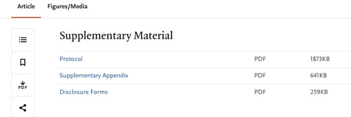 My case that something questionable is going on here is simple, and rests largely on the study protocol the authors wrote as part of their Institutional Review Board (IRB) approval process. This document is listed and linked to right there in the supplementary section of their article’s NEJM page: