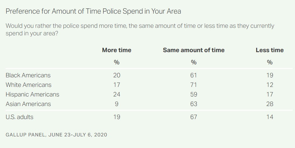 Hobbes blames “elites” for the unpopularity of these slogans. In other words, if not for a small group of powerful individuals, the masses would accept defunding the police and abolishing ICE. If Hobbes doesn’t mean this, what does he mean? This is a pretty wild claim given the available polling. For example, polling conducted by Gallup in late July 2020, which was more or less the peak of the national outcry over racist policing, showed that black Americans overwhelmingly wanted police to spend more time (20%) or the same amount of time (61%) as they currently were (that’s 81% overall), as compared to just 19% who wanted a reduction in police presence.