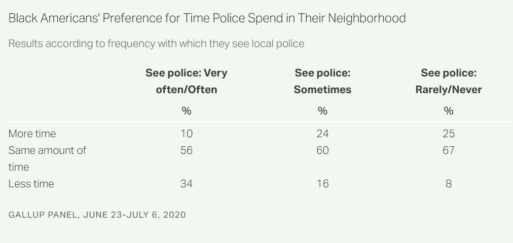 Even black Americans who already said they saw the police “a lot” broadly disfavored having them spend “less time” in their neighborhood, with this option garnering only 34% approval among that subset: