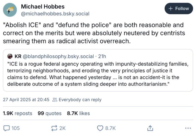 As for “defund ICE,” you may recall that the last time Trump was elected, when he was engaging in a (significantly more legal) crackdown on undocumented immigrants, some on the left began bandying this about as a catchphrase. I’ve been pretty open about my disgust with Trump 2.0’s immigration policies and think that any accusations of ICE lawlessness should be thoroughly investigated (which, ha!). In short, I doubt I disagree all that much with Hobbes, in a zoomed-out sense.