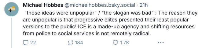 You see this a lot but it’s dumb. The question of whether a slogan is remotely popular and achievable is totally separate from the question of whether the slogan would lead to morally desirable outcomes. Notwithstanding the above uncertainty about what, exactly, “abolish ICE” means, it could be the case that it’s an unnecessary agency and that it would do moral good, on net, to abolish it. But if in the course of attempting to achieve this end, you make political life easier for the party sending random migrants to a Salvadoran torture prison, causing more random migrants to be sent to a Salvadoran torture prison, “But I chanted the good slogan!” isn’t going to provide you or your comrades with much comfort down the road.
