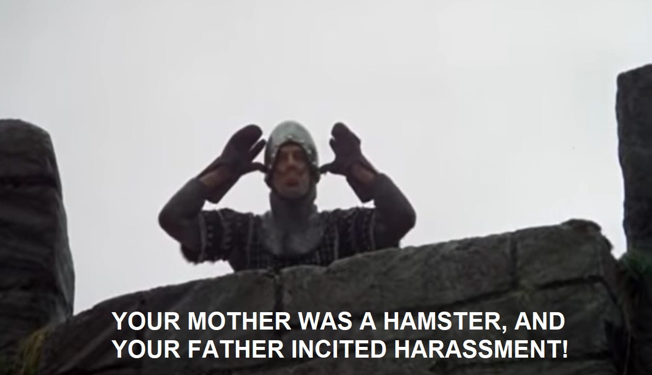Questions? Comments? Threats to publicly quote from this newsletter, thereby harassing a Jewish writer? I’m at singalminded@gmail.com or on Twitter at @jessesingal. Image of the Insulting Frenchman from Monty Python and the Holy Grail, but with the subtitle replaced with “YOUR MOTHER WAS A HAMSTER, AND YOUR FATHER INCITED HARASSMENT,” taken from here.