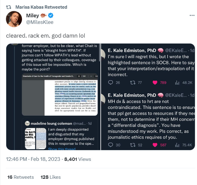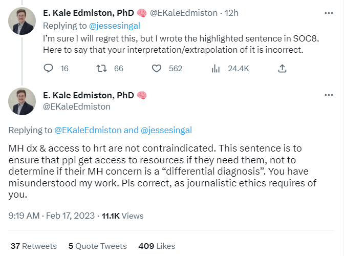 Then Edmiston tweeted at me directly: “I’m sure I will regret this” — hold that thought — “but I wrote the highlighted sentence in SOC8. Here to say that your interpretation/extrapolation of it is incorrect.” Next tweet: “[Mental health diagnoses] & access to [hormone replacement therapy] are not contraindicated. This sentence is to ensure that ppl get access to resources if they need them, not to determine if their MH concern is a ‘differential diagnosis’. You have misunderstood my work. Pls correct, as journalistic ethics requires of you.”