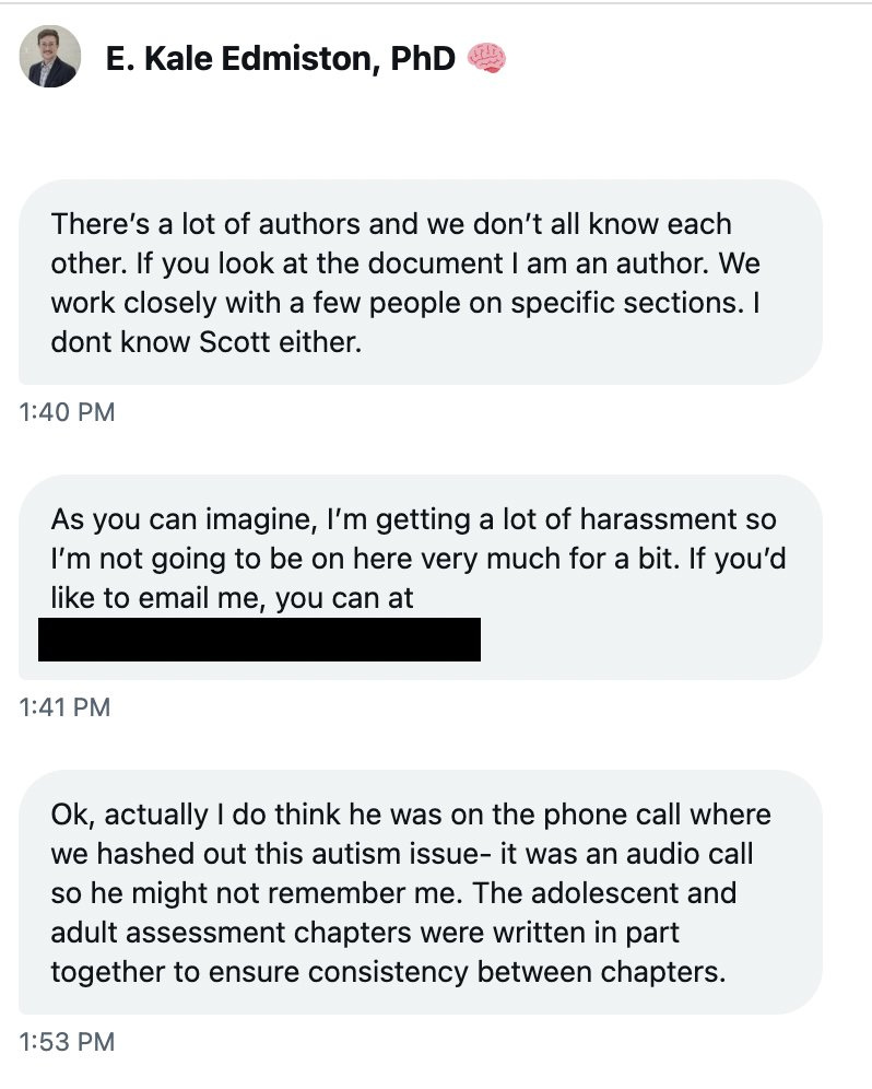 Edmiston also told Hobbes: “Ok, actually I do think he was on the phone call where we hashed out this autism issue- it was an audio call so he might not remember me. The adolescent and adult assessment chapters were written in part together to ensure consistency between chapters.”