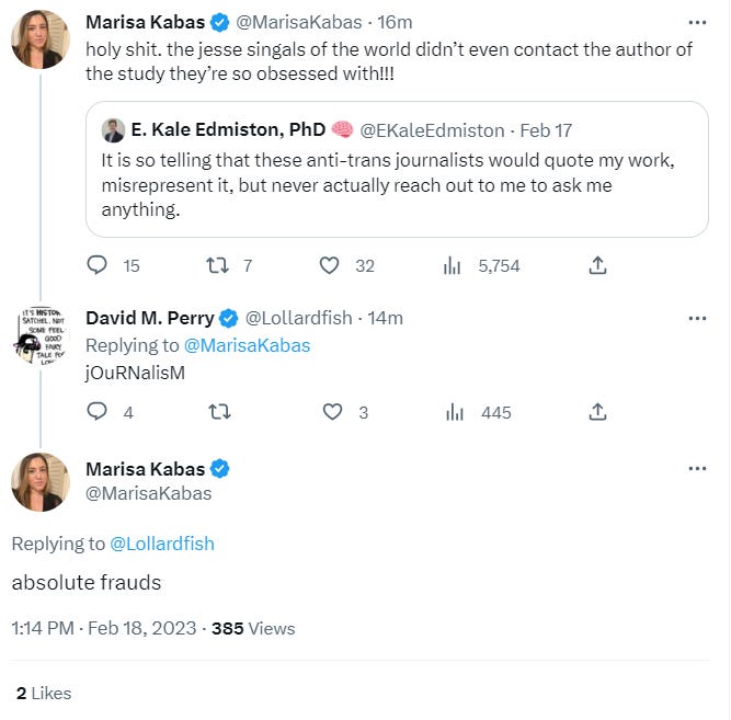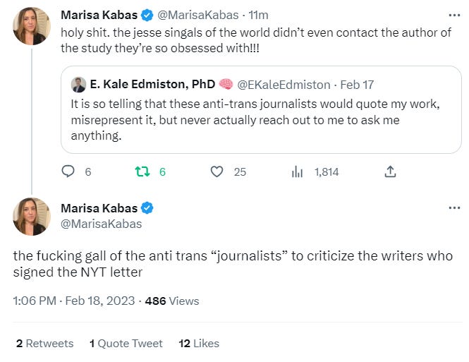 Marisa Kabas, a columnist at MSNBC, was gleeful: “holy shit. the jesse singals of the world didn’t even contact the author of the study they’re so obsessed with!!!” (It’s not a study.) Then: “the fucking gall of the anti trans ‘journalists’ to criticize the writers who signed the NYT letter.”
