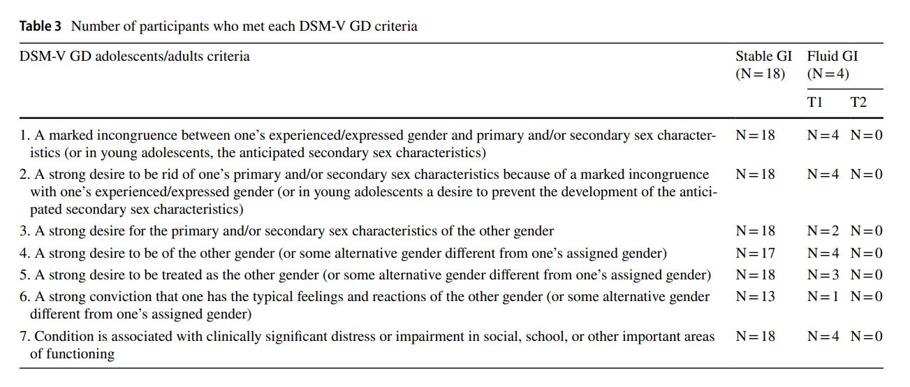 Second citation: Strang, Powers et al., 2018 drew on the results of interviews with 22 “gender-diverse” adolescents with autism to get their perspectives on transitioning and other issues. It includes a chart showing that there was some fluctuation, over the course of the ten months between the study’s two post-baseline check-ins, in whether the kids qualified for a DSM-5 GD diagnosis. Specifically, four of the 22 adolescents went from meeting the criteria to not.