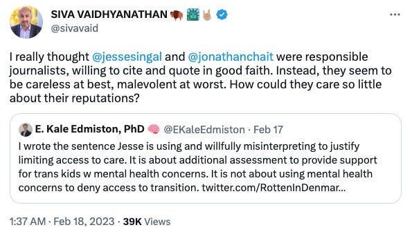 Siva Vaidhyanathan, a professor of media studies and podcast host, wrote: “I really thought @jessesingal and @jonathanchait were responsible journalists, willing to cite and quote in good faith. Instead, they seem to be careless at best, malevolent at worst. How could they care so little about their reputations?”