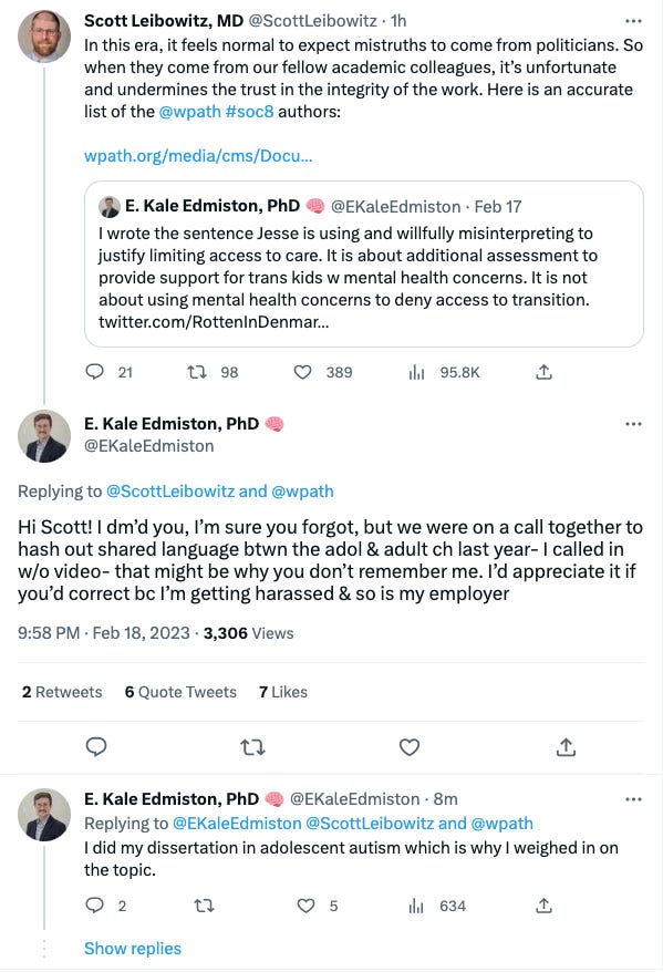 There is simply no way a good-faith person can come away from all of this believing that “I wrote the highlighted sentence in the WPATH SOC8,” “I wrote the sentence Jesse is using and willfully misinterpreting to justify limiting access to care,” and “I wrote the highlighted sentence in SOC8” are true statements on the part of Dr. E. Kale Edmiston. (I sent WPATH a couple requests for comment and heard back Monday. The email read in part: “The Standards of Care for the Health of Transgender and Gender Diverse People, Version 8, was developed by 119 authors. It is WPATH’s intent that through the process of rigorous review of all evidence and ideas, the SOC8 Revision Committee will reach consensus on guidelines that can hold up to scrutiny within health science and human rights standards, and that will benefit the people they are meant to serve on a global level. The use of a Delphi process [my link] to reach agreement on the recommendations among SOC-8 committee members. No one person is responsible for a single sentence or chapter, it was a collaborative consensus document among leaders in the field of TGD health.”)