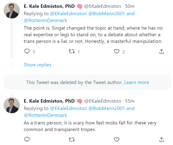 Edmiston, for his part, has a theory about why he received so much heat online this weekend: transphobia. “The point is, Singal changed the topic at hand, where he has no real expertise or legs to stand on, to a debate about whether a trans person is a liar or not. Honestly, a masterful manipulation.” And then: “As a trans person, it is scary how fast mobs fall for these very common and transparent tropes.”